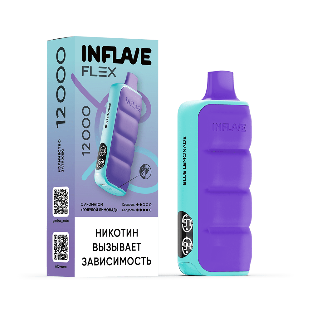 | Количество затяжек, шт12000 | Крепость, %2 | ЛинейкаINFLAVE FLEX 12000 |